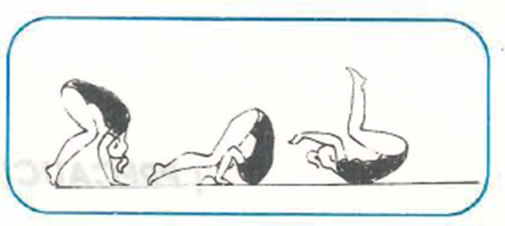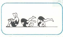 SIENTESE Y RUEDE ATRAS SOBRE LA ESPALDA, LLENADO LAS RODILLAS CONTRA EL PECHO, APOYE LAS PALMAS DE LAS MANOS EN E PISO DETRAS DE LOS HOMBROS, LOS DEDOS DIRIGIDOS HACIA ELLOS, PULGAR JUNTO A LA OREJA Y APOYE LOS PIES DETRAS DE LA CABEZA.