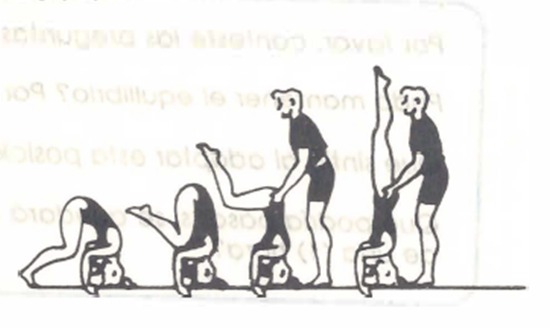 Posición inicial de pie con una pierna adelantada y brazos a la vertical, el peso sobre la pierna posterior. Desde esta posición provocaremos un desequilibrio del cuerpo hacia adelante mediante un cambio de peso a la pierna adelantada, en una acción similar a una balanza. Los brazos, alineados con el tronco y la pierna posterior, van a buscar el suelo, al mismo tiempo que la pierna se eleva, logrando con ello el impulso necesario para subir a la vertical y alinear todo el cuerpo.