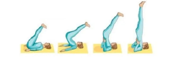 2.Generando tensión en los brazos como punto de apoyo eleva la zona baja de la espalda quedando apoyado en los omoplatos, a la altura de la cabeza deben llegar nuestras rodillas.